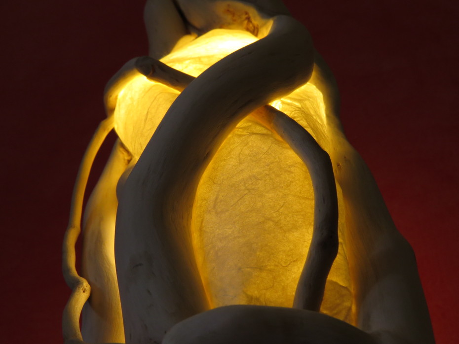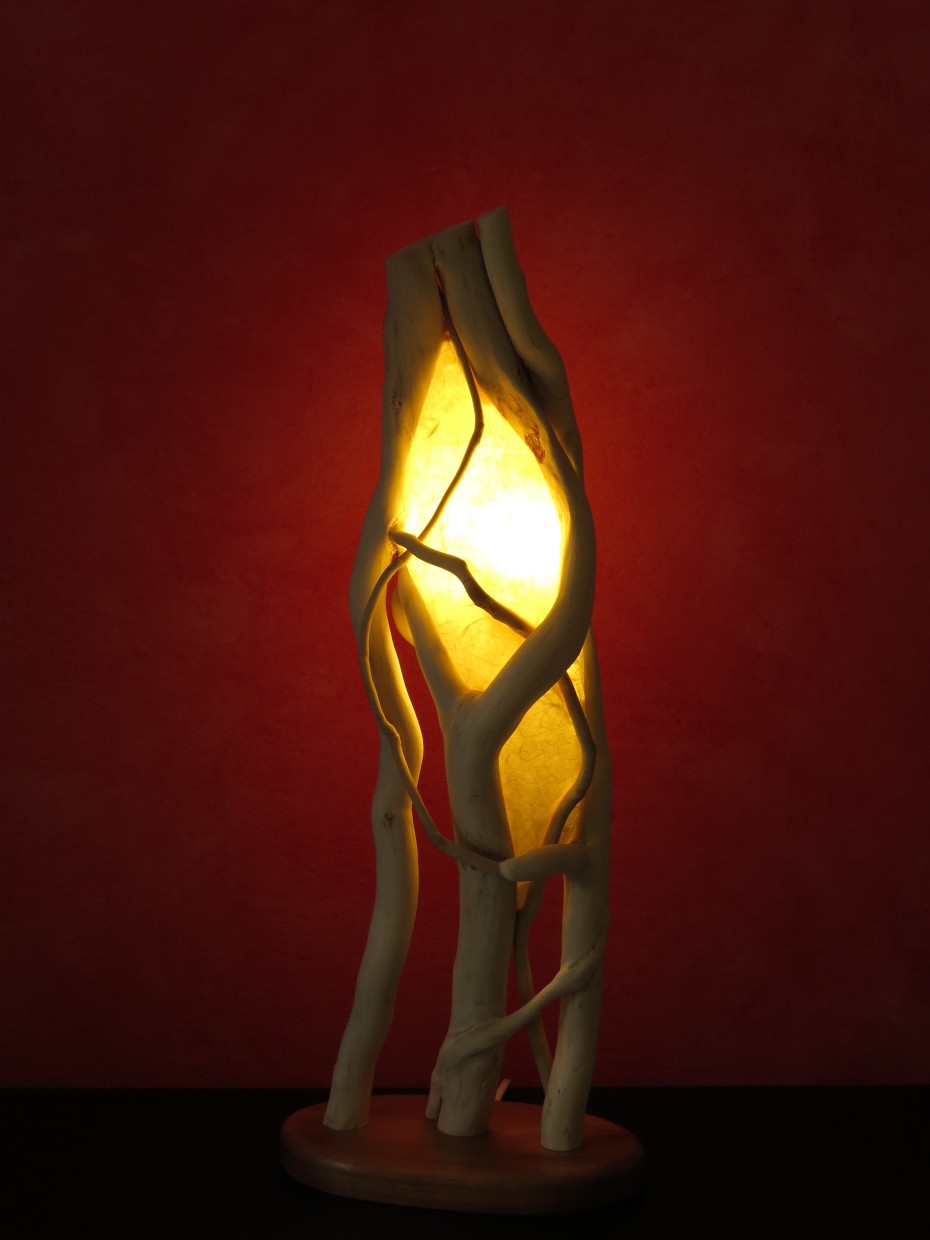 Descrizione: Lampada. Pezzo unico. La sua peculiarità risiede nella sua semplicità e nelle linee sinuose che la contraddistinguono. Base in cedro, 65x25
